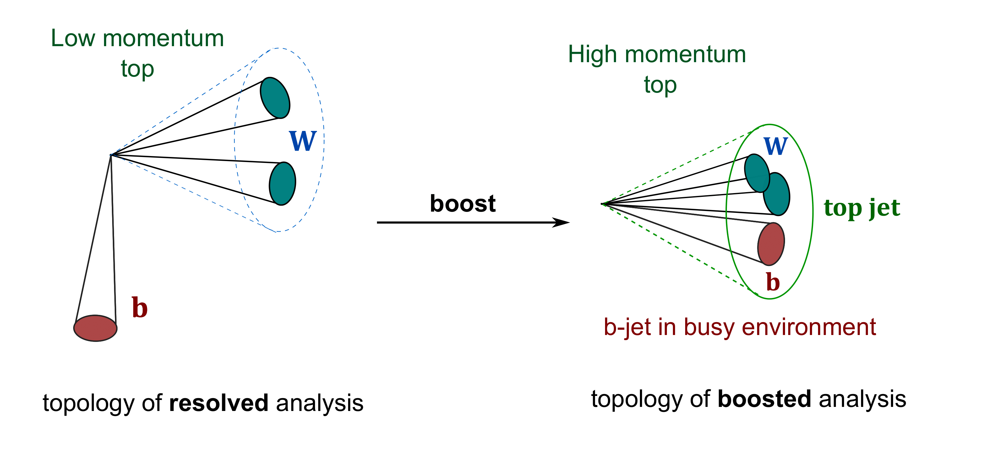 Top decay products can be very collimated along the top momentum or can be spread out depending on the top momentum. The two cases give rise to two top decay topology: boosted and resolved.